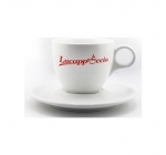 Lucaffe brand Logo in bold red. Commercial quality porcelain. (1 set is 1 cup and 1 saucer)